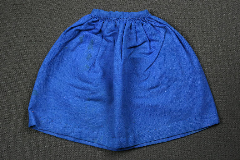 La gonna è di tessuto di lana blu con fodera di tela rosa e arricciatura in vita.