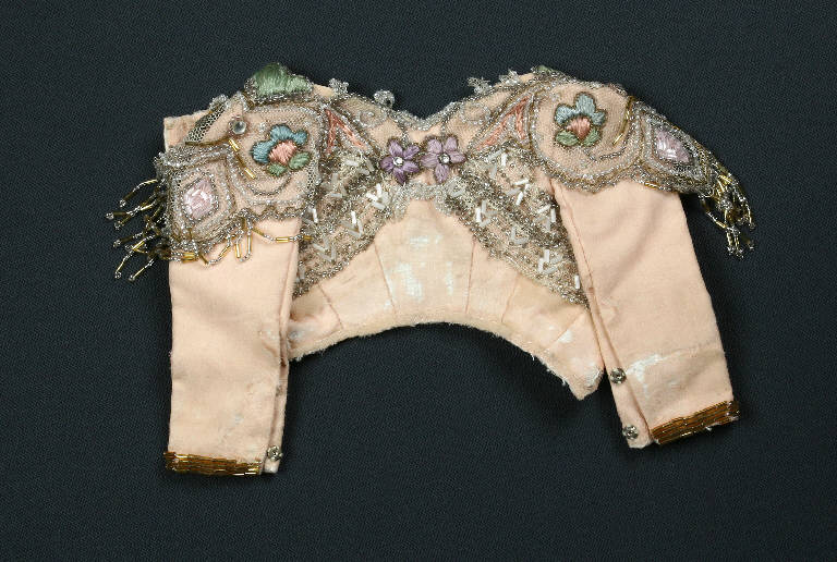 Il corpetto è di seta rosa con fodera di tela bianca, chiuso ai polsi con quattro automatici di metallo e decorato con canoutilles dorate. E' presente una ricca decorazione sul petto con ricami di perline e canoutilles bianche e dorate, vetri strass e ricami floreali di filo azzurro, rosa e verde; posteriormente due fiori ricamati con filo viola e vetri strass.