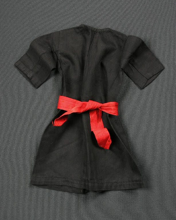 L'abito è di cotone nero chiuso con sistema a coulisse e con cintura di cotone rosso in vita.