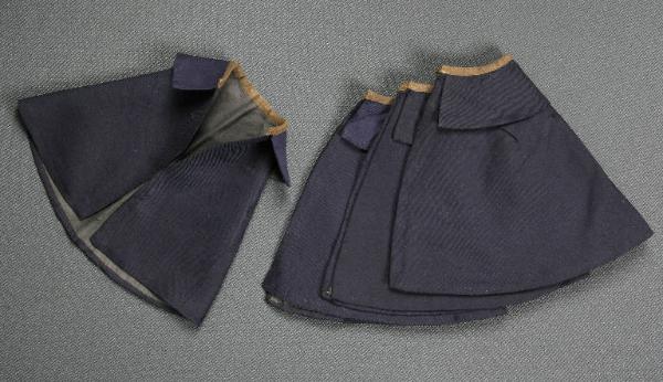 I mantelli, di forma trapezoidale con colletto e bordo stondato, sono di tessuto di lana blu con bordo superiore bordato con traversino marrone e fodera di tessuto nero.