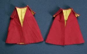 I mantelli, di forma trapezoidale con colletto e bordo stondato, sono di pannolenci rosso con bordo superiore bordato con traversino rosso e fodera di tessuto giallo.