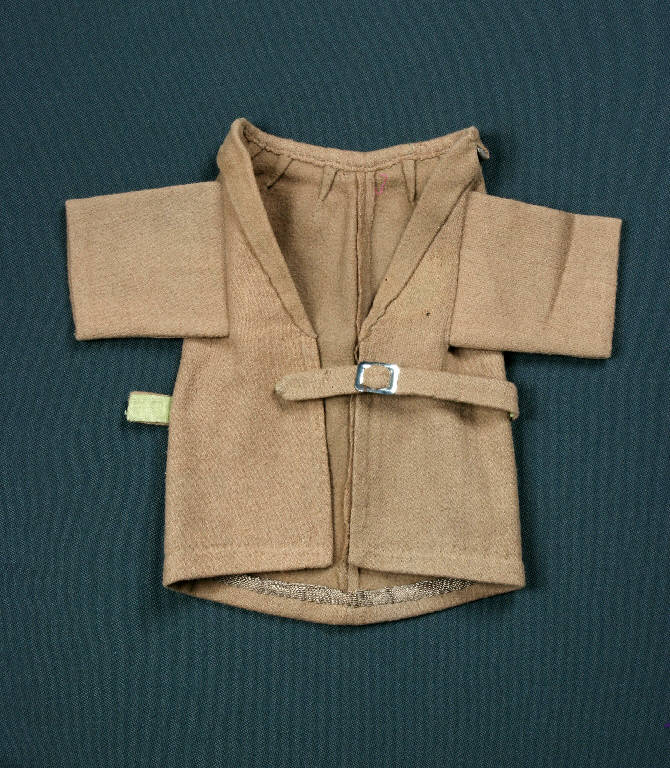 Il cappotto è di panno di lana nocciola sfoderato, con orlo interno profilato con nastrino marrone. Maniche con fodera di cotone color senape e cintura foderata dello stesso tessuto con fibbia in metallo.