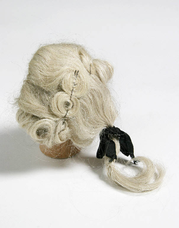 Parrucca maschile stile settecentesco realizzata con lunghi capelli bianchi. Su di una calottina di garza sono fissate due file di capelli: una sulla fronte pettinata all'indietro creando una serie di riccioli fissati con mollette e spilli, l'altra fissata sotto i riccioli forma un codino legato da un nastrino nero.