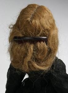 Parrucca femminile di capelli naturali color castano con calottina di garza bianca. La parrucca ha applicato sul retro un fermaglio ed è inchiodata alla testa della burattina PB 305 tramite chiodi.