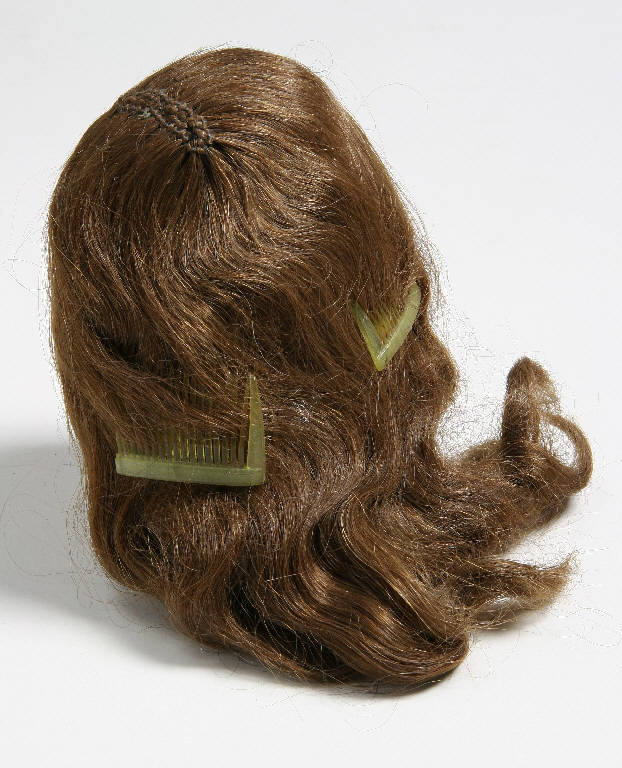 Parrucca femminile di capelli naturali castano chiaro, lisci e ondulati nella parte terminale. Pettinini di plastica gialla; calotta di garza bianca.