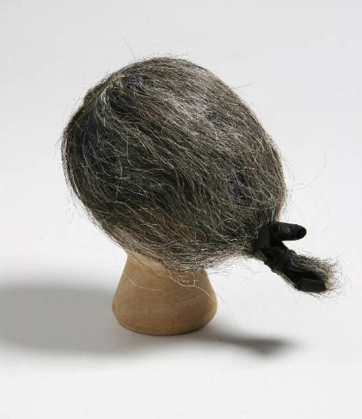Parrucca di capelli sintetici grigi annodati con un nastrino nero. Calotta di tela beige e blu.