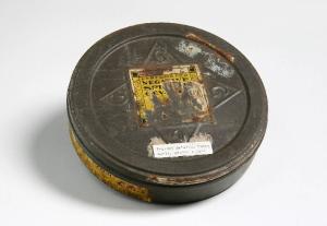 Scatola di metallo rotonda con stella e quadrato a rilievo sul coperchio. Nelle quattro punte della stella vi sono delle G mentre all'interno del quadrato è incollata un'etichetta gialla e nera. La scatola contiene bottoni di metallo rotondi.