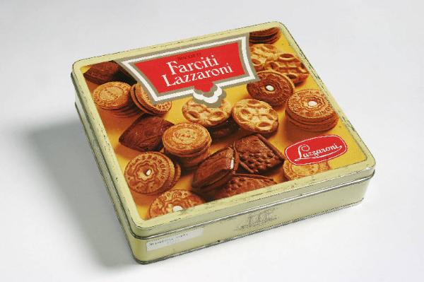 Scatola moderna della ditta Lazzaroni con etichetta incollata che riproduce una fotografia di biscotti e le scritte "Biscotti Farciti Lazzaroni" e il marchio "Lazzaroni". La scatola contiene una collana a tortiglione di metallo dorato, due catene di metallo argentato, una catena di metallo dorato con palline di avorio e una collana a cinque fili in ottone con tubicini alternati a palline.