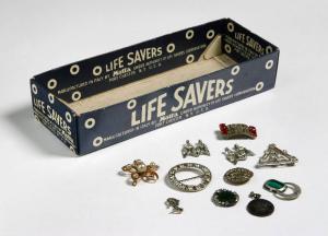 Scatola di cartone blu con scritta bianca "Life Savers" contenente diverse spille di metallo con strass, con pietre colorate ed una spilla di metallo dorato con piccole perle.
