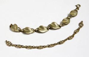 Due braccialetti in metallo dorato lavorato. Il bracciale leggermente più lungo è composto da maglie ovali e motivi ad intreccio, quello più corto ha maglie a forma di foglie.