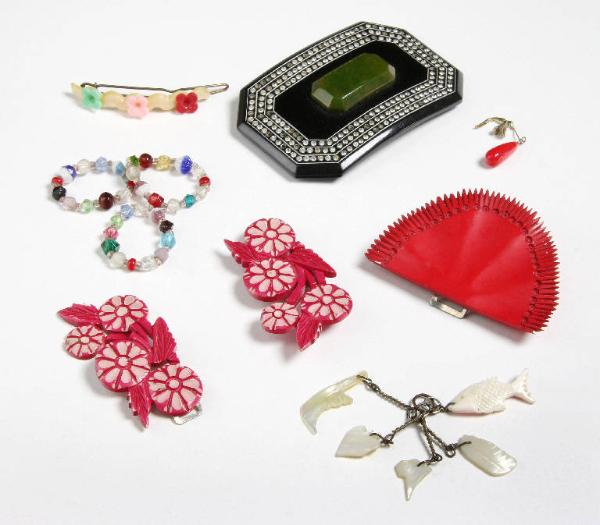 Braccialetto di pietre e corallini colorati, una spilla nera di forma rettangolare con strass e al centro una pietra verde, un fermaglio di plastica rossa, due fregi di plastica rosa a motivo floreale e uno rosso a forma di goccia, una mollettina di plastica con tre fiorellini colorati, cinque piccole catenine legate insieme con agganciate piccole figure in madreperla a forma di pesce e dente di squalo.
