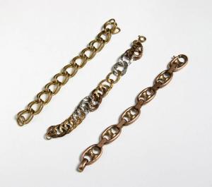 Tre braccialetti di metallo. Il primo dorato ad anelli doppi, il secondo a cerchi dorati e argento, il terzo color ottone con maglie ovali.