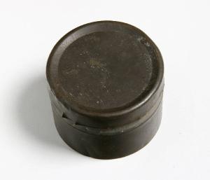 Scatola di metallo rotonda contenente bottoni di ottone semisferici o piatti e bottoni di metallo argentato di uguale forma.