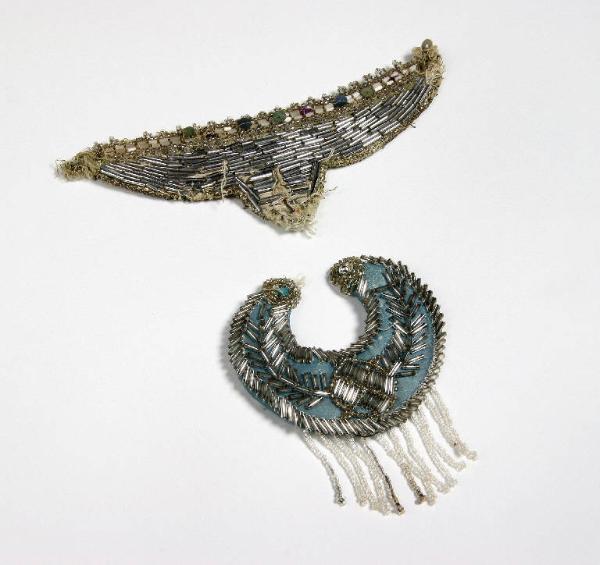 Applicazione a punta di tela a righe nere e azzurre con ricami di canoutilles argento, bianche, piccole paillettes colorate e perline trasparenti. Applicazione tondeggiante di seta azzurra imbottita ricamata con canoutilles argento e frangia di perline bianche.