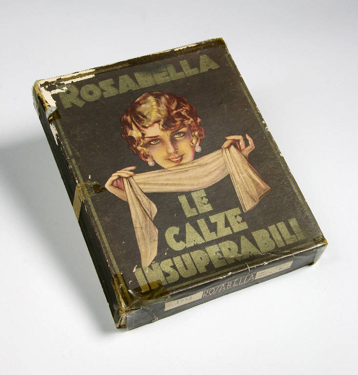 Scatola di cartone marrone con stampato un volto femminile e due mani che reggono una calza e la scritta "Rosabella le calze insuperabili". La scatola contiene: fiocco di canoutilles dorate infilate su ventiquattro fili; applicazione di canoutilles e perline; applicazione di canoutilles dorate e perline trasparenti su filo bianco; due strisce di canoutilles di vetro dorate; striscia di canoutilles e perline dorate; applicazione di canoutilles dorate e perline trasparenti; applicazione di canoutilles e perline trasparenti; striscia di perline argentate; applicazione di canoutilles dorate su tela bianca.