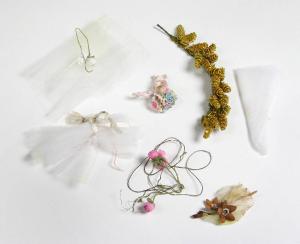 Tulle bianco abbinato a fiori di stoffa bianchi, rosa o marroni. Piccolo mazzetto di fiori azzurri e rosa, probabilmente di zucchero. Ramo con piccoli fiori gialli.