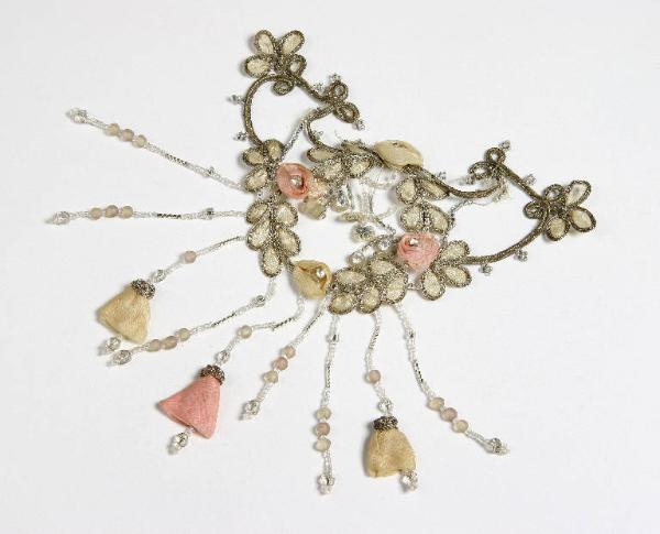 Applicazione floreale in filo laminato argento e seta rosa e beige con strass e perline.