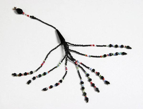 Decorazione realizzata con piccole perle nere sfaccettate e perline nere e colorate.