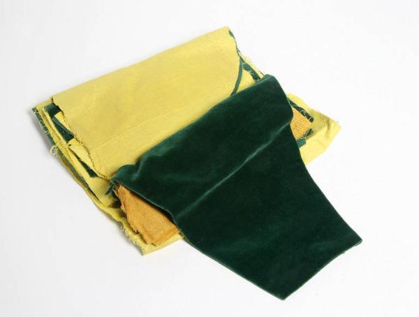 Tagli di velluto verde scuro liscio per la realizzazione di giacche maschili. Il velluto è già abbinato a tagli di tela gialla per la fodera delle giacche.
