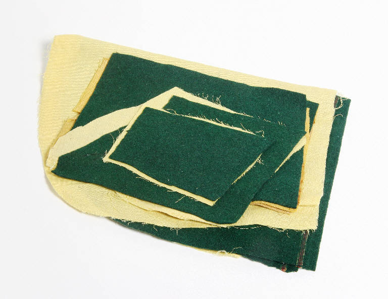 Tagli di panno di lana verde per la realizzazione di giacche maschili. Il panno è già abbinato a tagli di tela gialla per la fodera delle giacche.