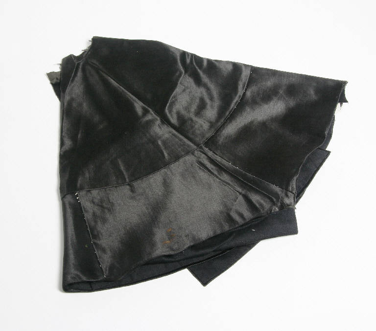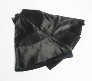 Taglio di raso nero cucito insieme ad un taglio di tessuto nero per la preparazione di un mantello da burattino.