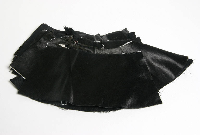 Tagli di raso nero abbinati a tagli di garza bianca per la preparazione di mantelli, colli e polsini da burattino.