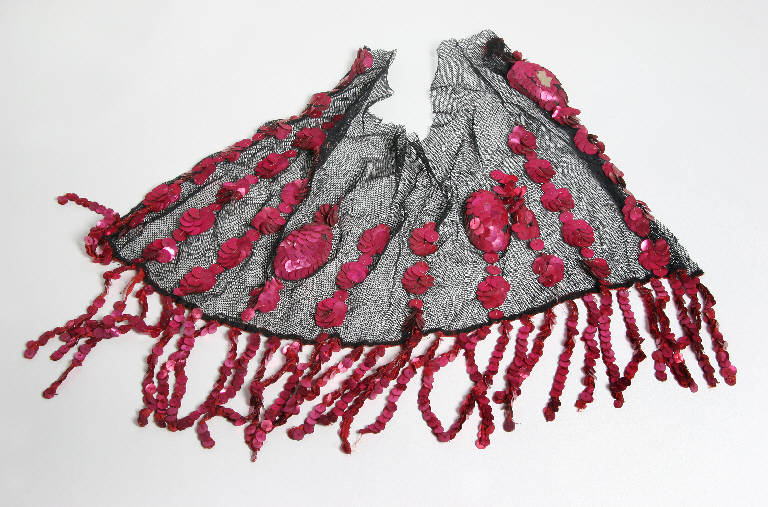 Mantellina da burattina non cucita nella parte superiore. Di tulle nero con ricami e frangia di grosse paillettes fucsia e applicazioni di decorazioni ovali di cartone ricoperto di paillettes fucsia.