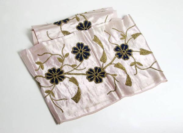 Tre tagli di raso rosa con ricami in laminato oro e velluto blu a soggetto floreale.