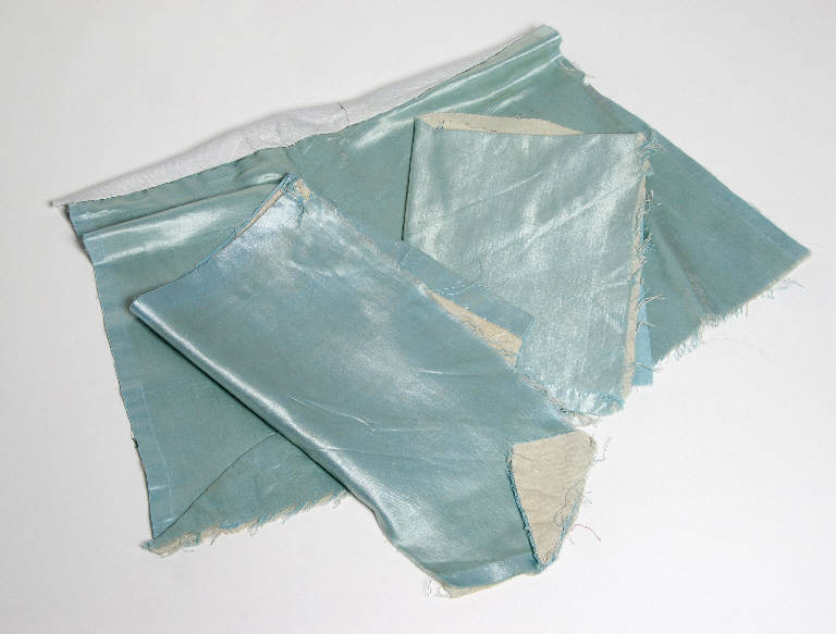 Tagli di raso azzurro con fodera di tela bianca per la realizzazione di giacche o vesti da burattino.