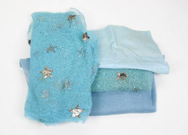 Tagli di cotone, tulle azzurro e garza azzurra con applicate stelle di carta stagnola per la preparazione di un abito da fata.
