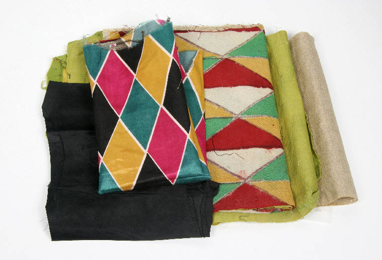 Tagli di tessuti diversi a tinta unita e colorati con motivi a rombi per la preparazione degli abiti da Arlecchino.
