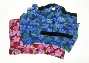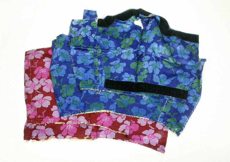 Abiti da burattina tagliati, cuciti ma non confezionati. Di raso rosso con fiori rosa e di raso blu con fiori azzurri e verdi e nastrino di velluto nero.