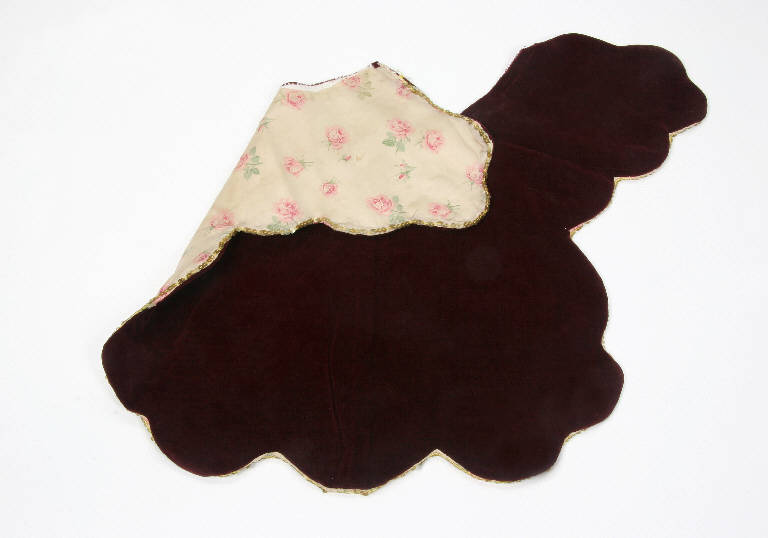 Mantello non finito per burattino. Di velluto marrone, fodera di seta beige con piccoli fiori rosa, orlo ondulato e decorato con piccole paillettes dorate.