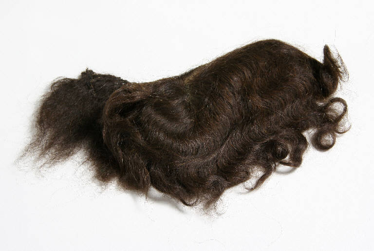 Frangia di capelli naturali castano scuro cucita su garza beige.