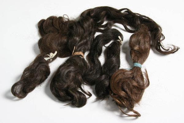 Quattro mazzetti di capelli naturali ondulati castani.