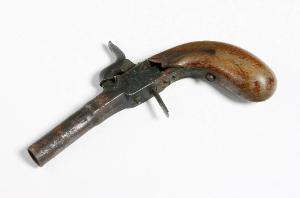 Pistola della fine dell'Ottocento con impugnatura di legno alla quale è avvitata la canna di ferro con intaglio in corrispondenza del cane e del grilletto. Il cane e il grilletto sono funzionanti.