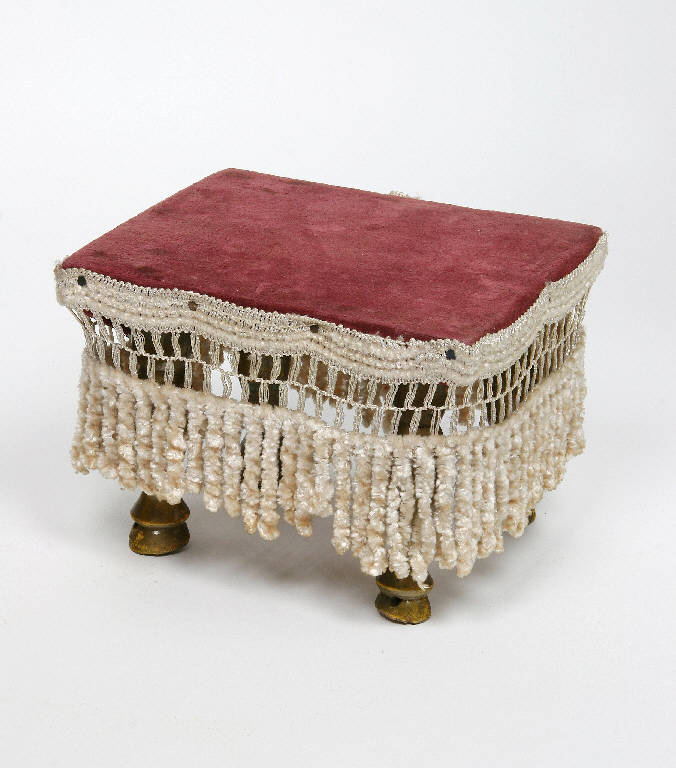 Sgabello di legno con gambe tornite e dipinte oro. La seduta è di compensato armato e ricoperto con velluto rosso. Ad essa è inchiodata una frangia bianca di passamaneria.