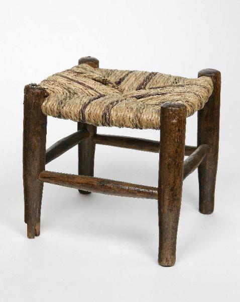 Sgabello di marionetta di legno con gambe e poggiapiedi di legno di sezione circolare, la seduta è impagliata e infilata in quattro tondini di legno incastrati e inchiodati alle gambe. La paglia usata è di colore giallo, verde e viola.