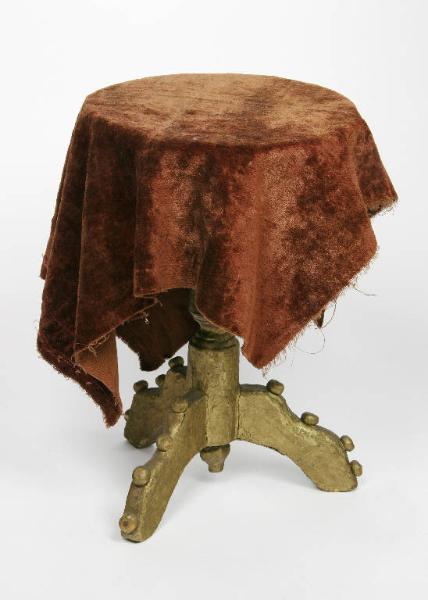 Tavolino di legno con piano rotondo senza dipintura, inchiodato alla colonna centrale alla quale sono poi inchiodati tre piedi di legno. Colonna e piedi sono dipinti con vernice oro. Su ogni piede sono inchiodati tre pomi in legno. Sopra il piano è posto un taglio di velluto marrone, sotto vi sono impresse delle scritte ed è armato con legni trasversali.