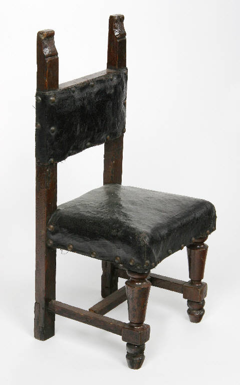 Sedia di legno con gambe tornite anteriormente, a sezione quadrata quelle posteriori. Poggiapiedi di legno a sezione quadrata; schienale con due montanti e una spalliera di legno ricoperta con finta pelle nera, imbottita e fissata con borchie metalliche. La seduta è in finta pelle nera, l'imbottitura è fatta con stoffa e nella parte interna sono visibili delle lamine di metallo incrociate tra loro che fungono da molle. Il legno è dipinto marrone e verniciato.