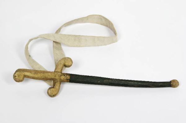 Spada di legno con elsa e punta rotonda dorate e lama dipinta di nero. Ha inchiodata una fascia di tela per fissarla a tracolla della marionetta. Il braccio trasversale dell'elsa presenta una punta rivolta verso l'alto e l'altra verso il basso.