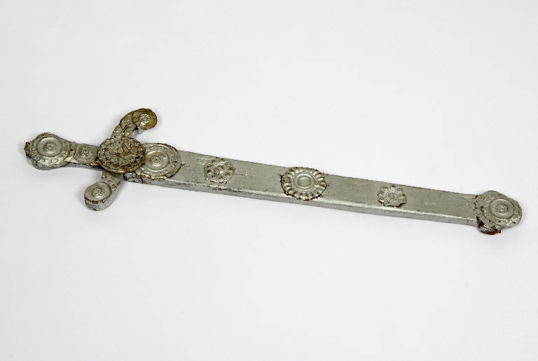 Spada di legno dipinta d'argento con borchie metalliche sull'elsa e sulla lama.