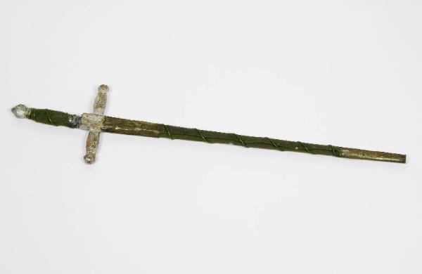 Spadino di legno rivestito di velluto verde con punta e parte della lama ricoperte con lamina d'ottone. Elsa dipinta d'argento e rivestita di velluto. Un filo di ottone si avvolge a spirale intorno alla spada.