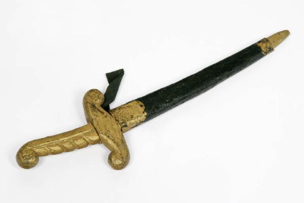 Spada di legno con lama dipinta di nero e punta dorata. L'impugnatura è intagliata è dipinta con color oro. Ha inchiodato un anello di traversino nero per l'aggancio alla cintura della marionetta.