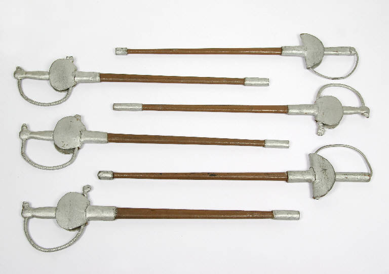 Lama di legno verniciato in marrone con puntale di cartone arrotolato attorno alla punta di legno, fissato con chiodi e verniciato color argento. Elsa a due lobi di cartone pure fissata con chiodi e dipinta in color argento. Impugnatura di legno verniciato color argento. Guardia di fil di ferro, fissata al pomolo e all'interno dell'elsa, ricoperta da una spirale di corda e verniciata color argento. Due spade non hanno la guardia ricoperta di corda ed hanno il fil di ferro verniciato color argento.