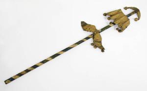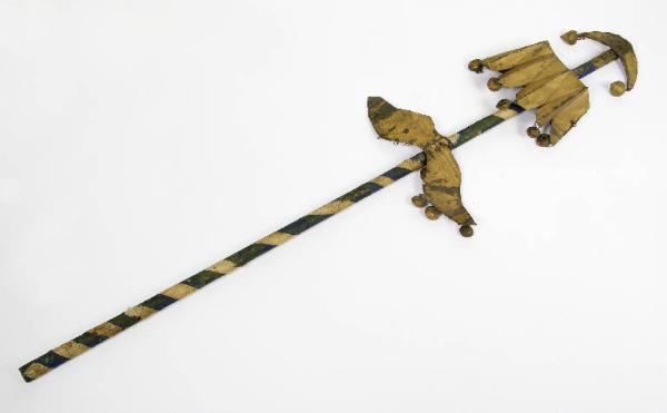 Flabello di legno dipinto di blu con carta quadrettata incollata a spirale. Al flabello sono inchiodate tre decorazioni di lamiera dorata di varie forme alle quali sono fissati con fil di ferro dei sonagli di forma sferica e tre di forma conica.