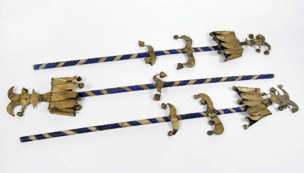 Tre flabelli di legno dipinto di blu con carta quadrettata incollata a spirale. Al legno sono inchiodate tre decorazioni di lamiera dipinta d'oro di forme articolate e con sonagli di forma sferica e forma conica fissati con filo di ferro.