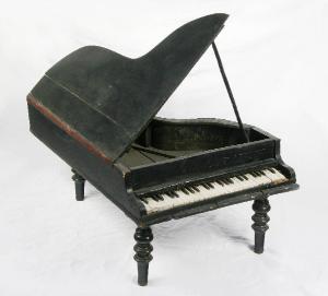Finto pianoforte a coda in legno dipinto di nero che veniva utilizzato negli spettacoli di marionette. Tre gambe tornite e tasti dipinti in bianco e nero.