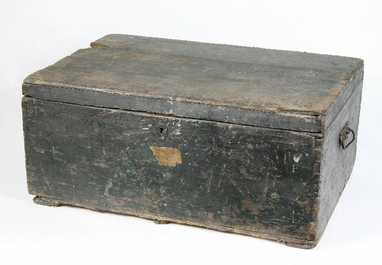 Baule di legno rettangolare con coperchio incernierato, gancio di chiusura in metallo e maniglie laterali, dipinto esternamente in color verde.