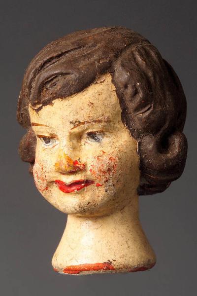 Figura femminile.Testa giocattolo di burattina tornita con capelli intagliati e dipinti di marrone. Lo stucco di base è colorato di arancione sul quale è stato riportato l'incarnato chiaro con labbra rosse.